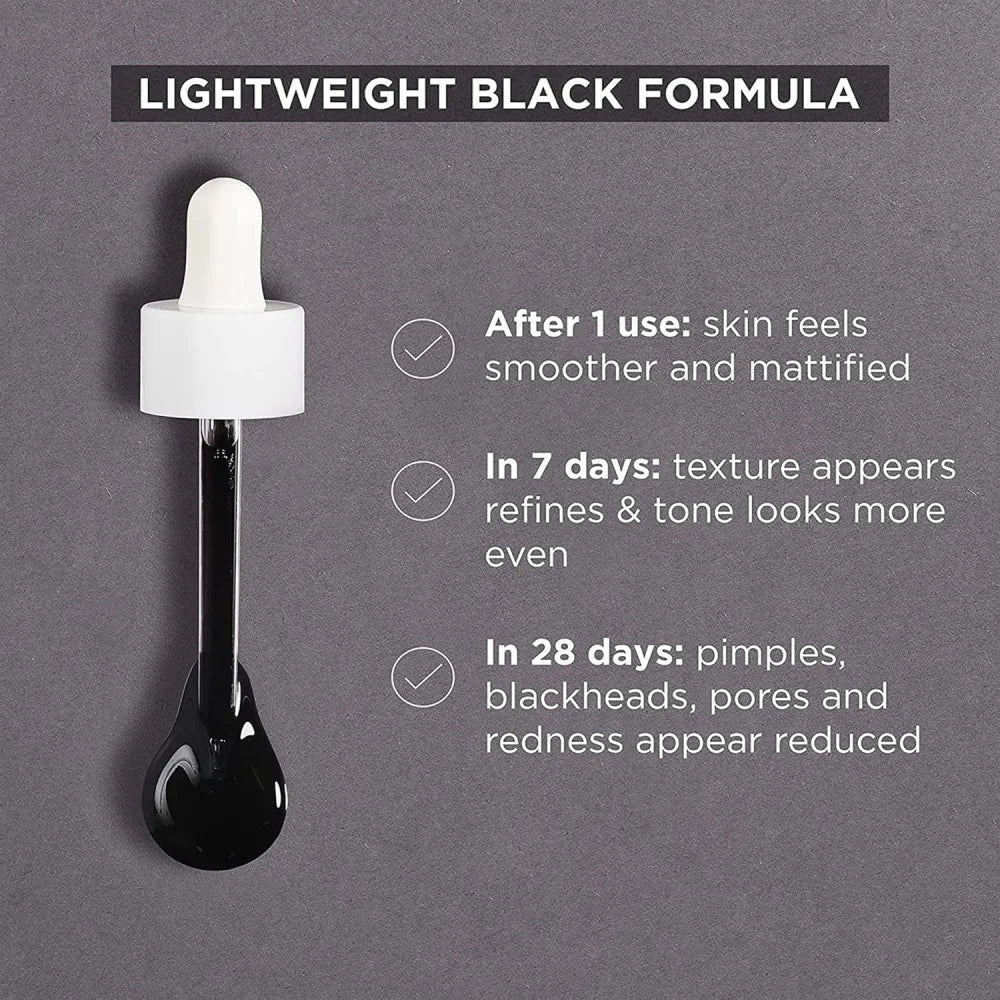 It resurfaces the skin for a smoother, more even tone and a mattified finish. The lightweight, fast-absorbing black serum rubs in clear and leaves no residue. Dermatologically tested, vegan, cruelty-free, and suitable for sensitive, oily and acne-prone skin.