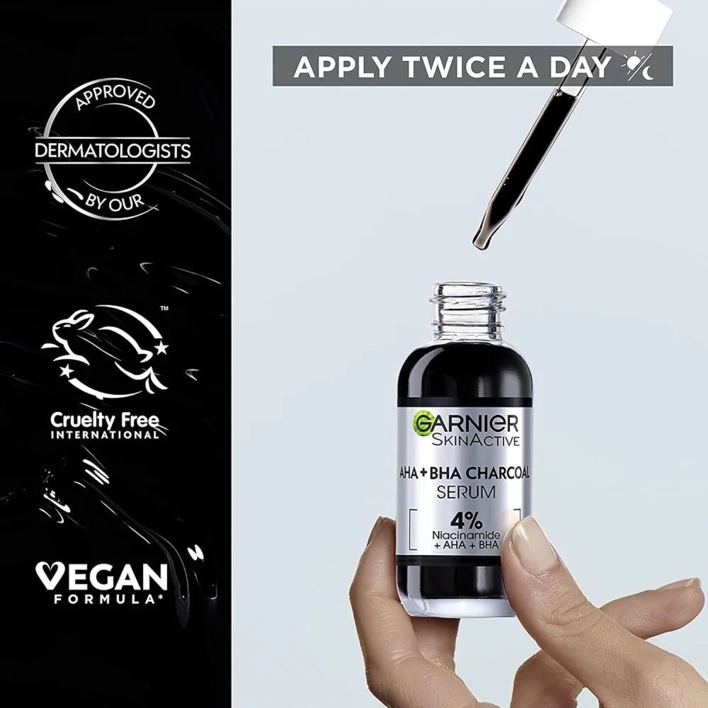 A powerful serum formulated with 4% AHA + BHA + Niacinamide and Charcoal to visibly reduce pimples, blemishes, residual marks, blackheads and pore visibility.