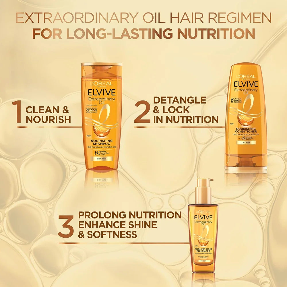 Transform your hair with the luxurious touch of L'Oréal Elvive Extraordinary Oil Nourishing Shampoo.